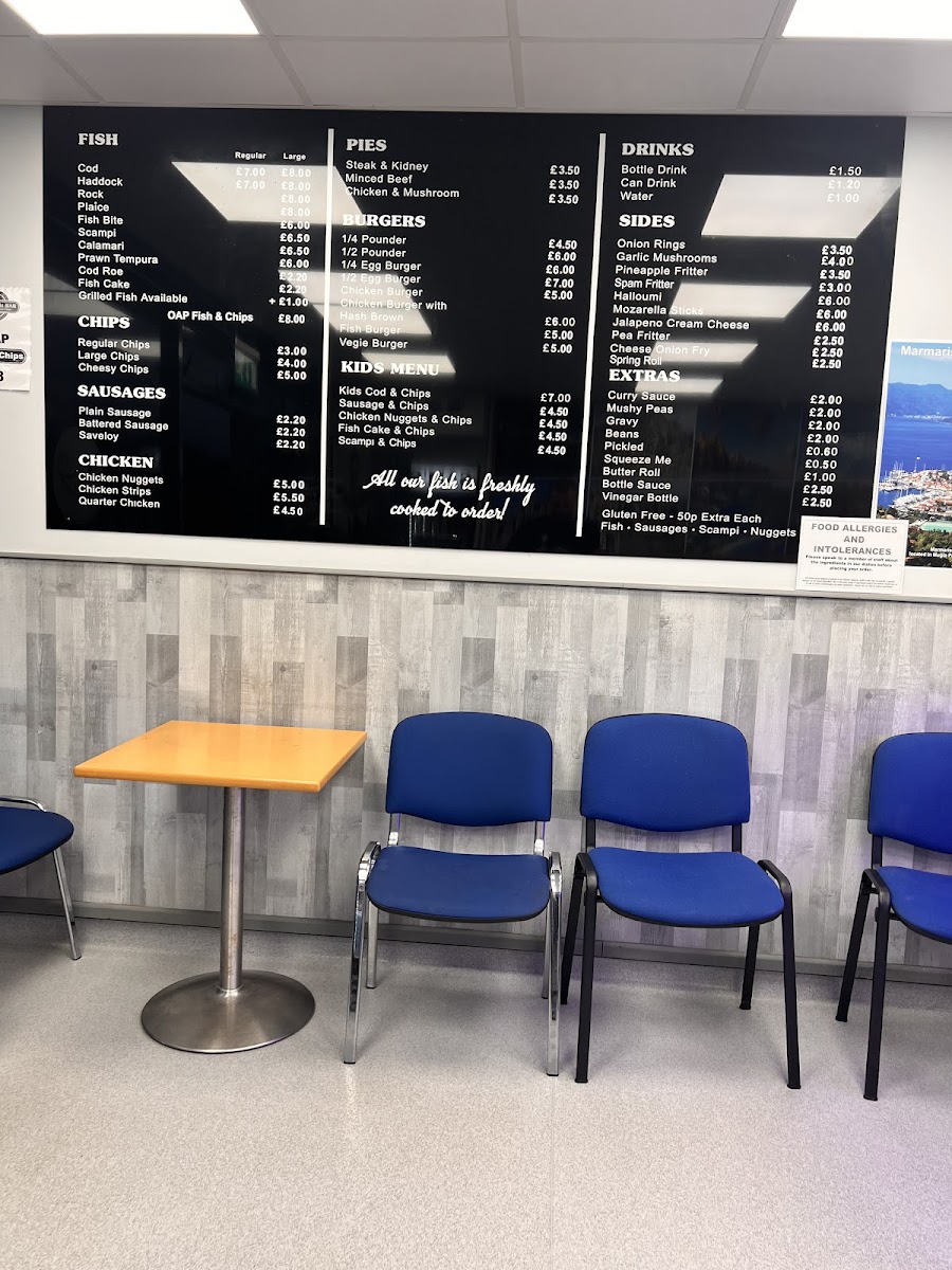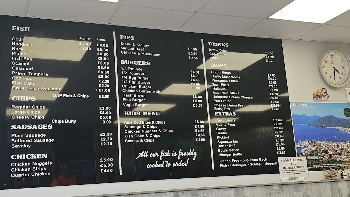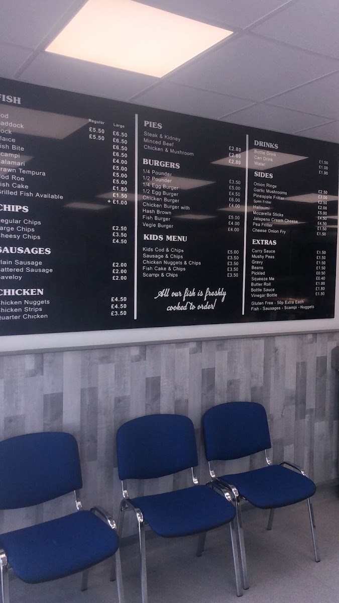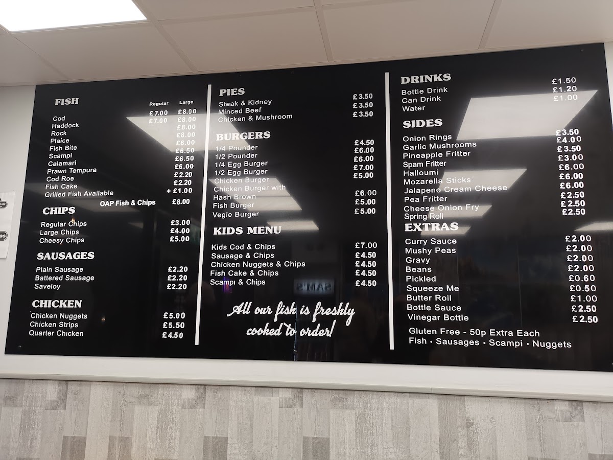 From a reviewer’s perspective, the menu at Sam’s Fish Bar Cowplain offers a solid, traditional selection that covers all the classic chip shop favourites at reasonable value. The fish options like Cod, Haddock, Rock Plaice, and Fish Bite form the core of the menu, while hearty pies such as Steak & Kidney, Minced Beef, and Chicken & Mushroom provide comforting alternatives. The burger range includes 1/4 Pounder, 1/2 Pounder, 1/4 Egg Burger, 1/2 Egg Burger, and Chicken Burger, making the menu accessible for non-fish eaters as well. Sides are well represented with Regular Chips, Large Chips, and Cheesy Chips, and the kids’ options like Kids Cod Bites & Chips, Sausage & Chips, and Chicken Nuggets & Chips make it family-friendly. Extras such as Curry Sauce, Mushy Peas, and Gravy round out the experience, alongside sausages like Plain Sausage, Battered Sausage, and Saveloy, plus chicken items including Chicken Nuggets, Chicken Strips, and Quarter Chicken. Overall, the menu is varied, filling, and exactly what you would expect from a reliable local fish and chip shop.